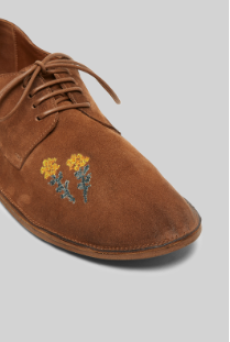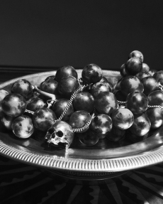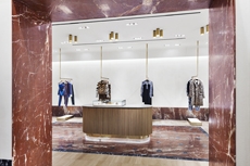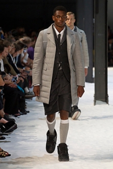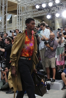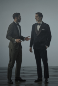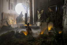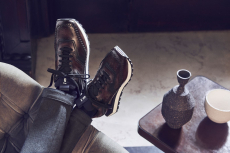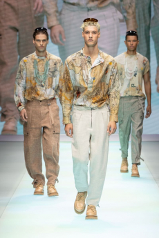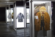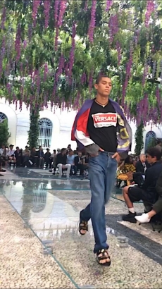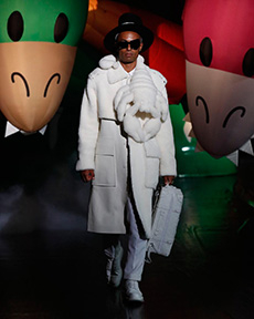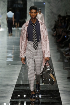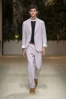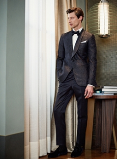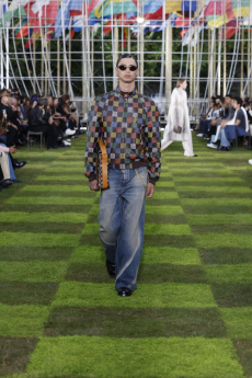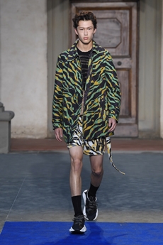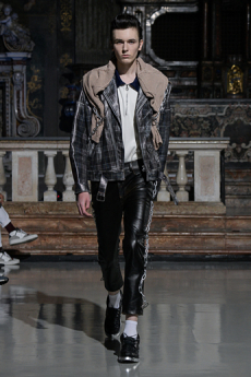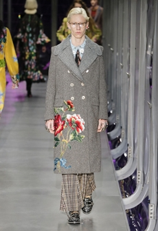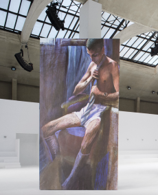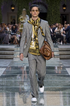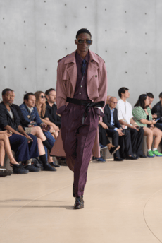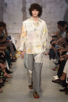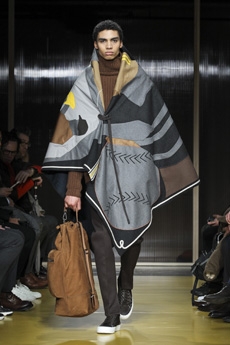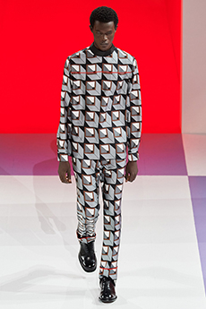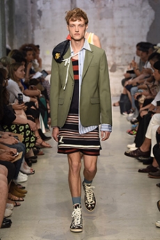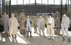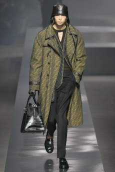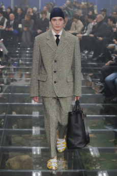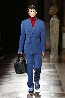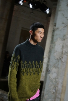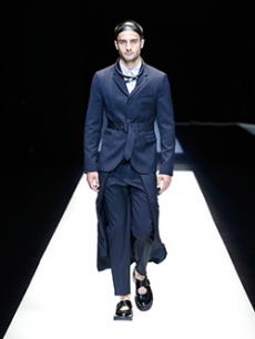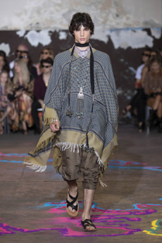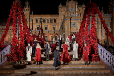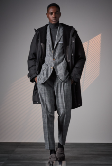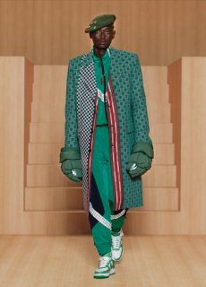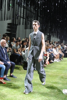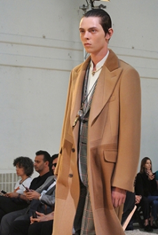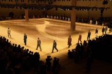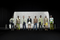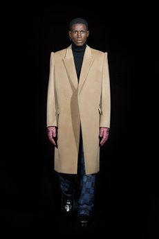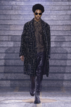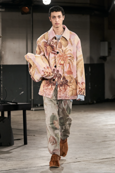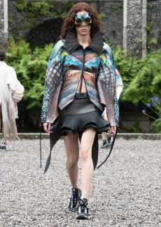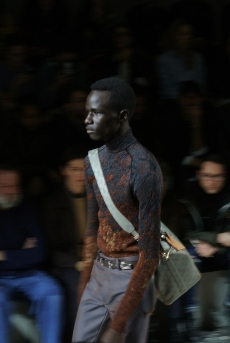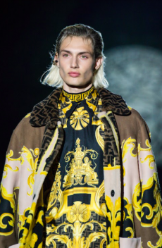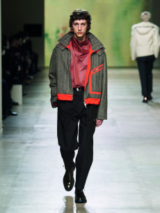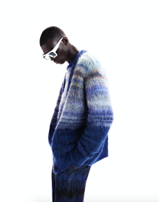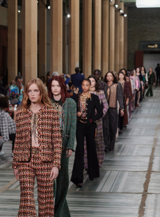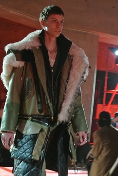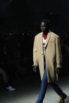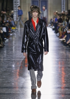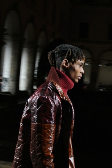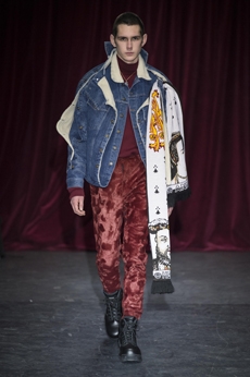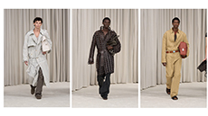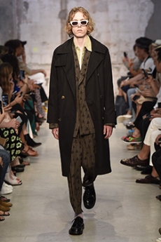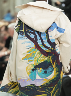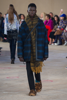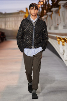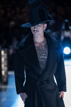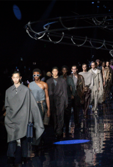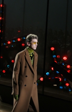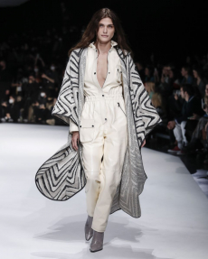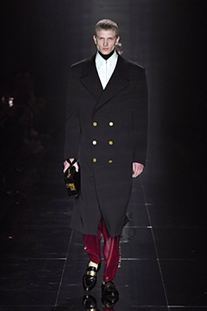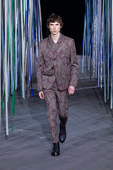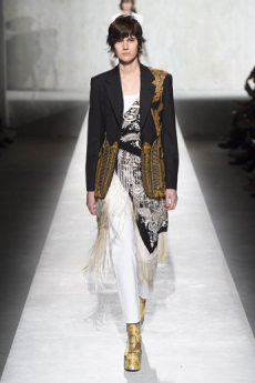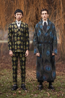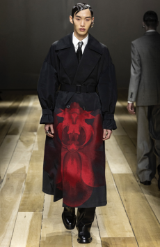 Alexander McQueen documents this journey through his latest menswear collection, paying homage to the man who has become synonymous with the term 'esthete'. British tailoring plays a central role in a collection that encapsulates and celebrates the house's trademark codes. Precise and elongated cuts in suits with peaked shoulders and legged or flare trouser silhouettes – worn cropped above the ankle and sometimes with a satin or velvet band on the sides, offer their elegance to coats and jackets alongside jacquards with peacock feathers for the most daring dandies. The collection also explores and plays with proportions, combining classic and more of-the-moment oversized fits to give birth to a new hybrid of men's shirt-dresses. A worn-in feel is brought forward by mohair knits, frayed at the edges and laddered with holes. For the evening, Alexander McQueen’s Fall/Winter 2017 features tuxedos, smoking jackets and robes with satin quilted reveres, embroidered velvet and jacquard to give an incredible taste of elegance to a collection that is worth of an old-fashioned gentleman.