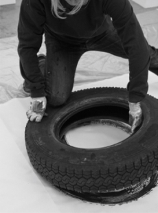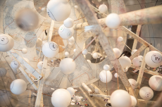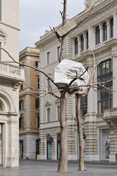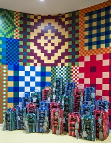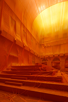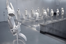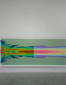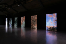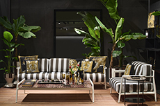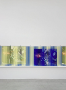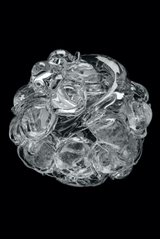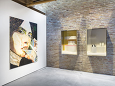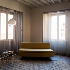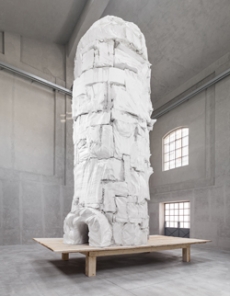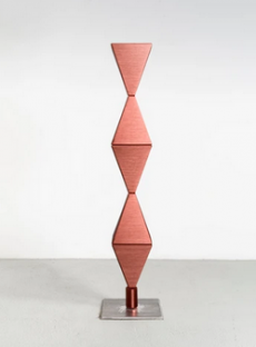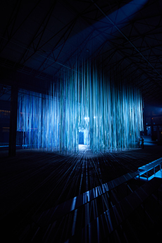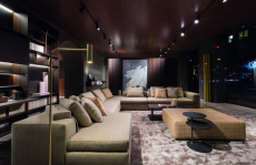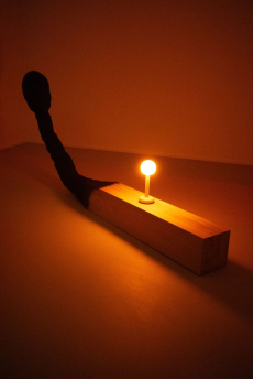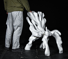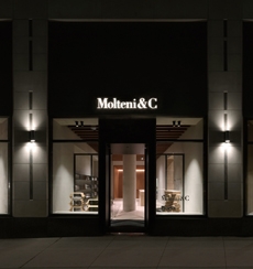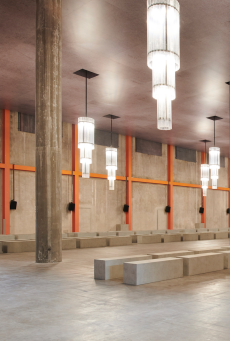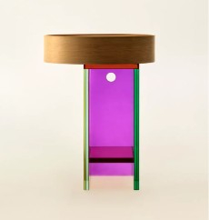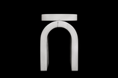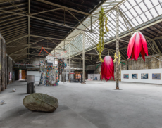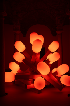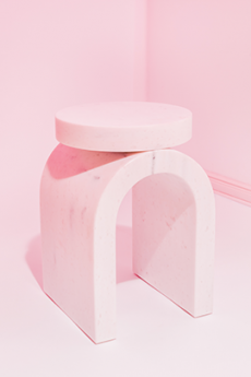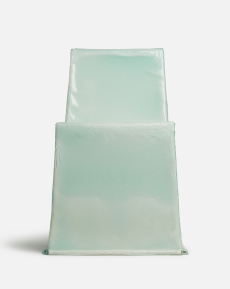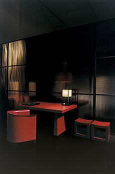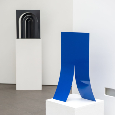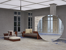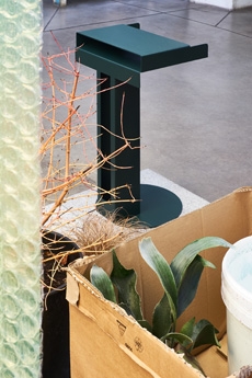 For New Tendency's exhibition at the Meiré und Meiré Factory, Mike Meire grouped the December edition pieces with side tables from the META line to create an island in the middle of the space. The installation was staged on raw concrete and stone slabs between dry plants, paint buckets and cardboard boxes. Fluorescent lights floated above it, different colours and textures of plastic foil sheets hanging over the top. The industrial ensemble was characterised by deliberately rudimentary fragmented elements that served as a beautiful contrast to the high-end claim of the products on display.