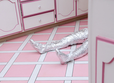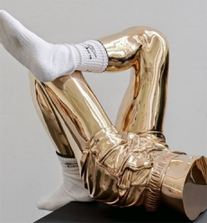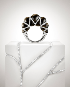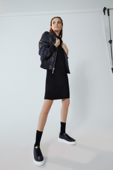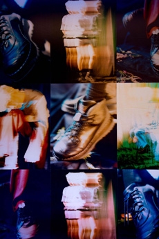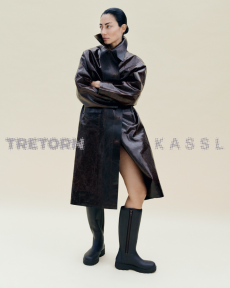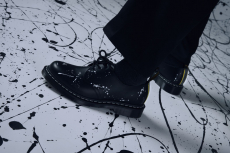 The austerity of black in contrast with lurex and silver mirror smooth leather uppers, plexi-heels, pearls inlaid into a metal frame sole and luxurious black suede, adorn the collection in a play of contrasts. The name of the collection also refers to a new fabric created by Kirkwood: a black glittering stretchy textile used for a new sock-boot and a slip-on mule. It’s a rich and sophisticated collection with new silhouettes and the omnipresent irreverent mood of Kirkwood’s work