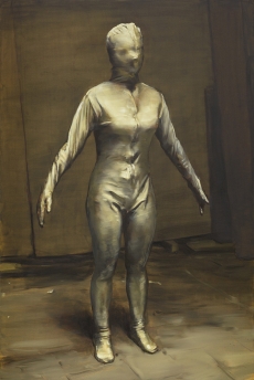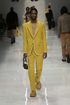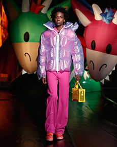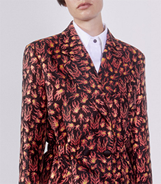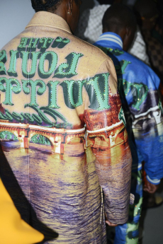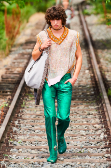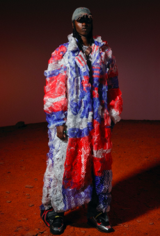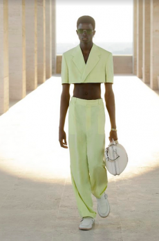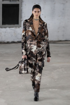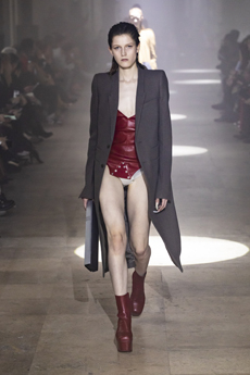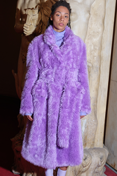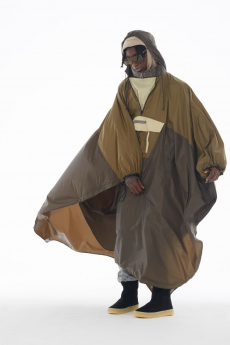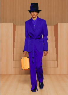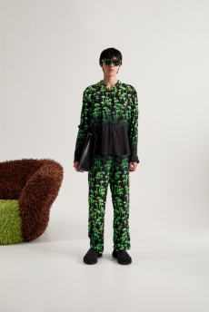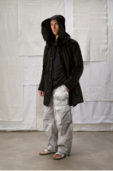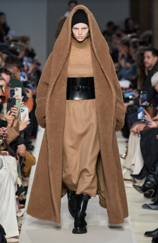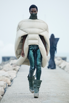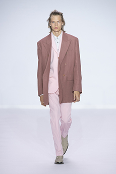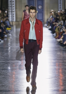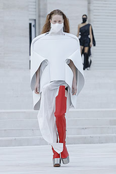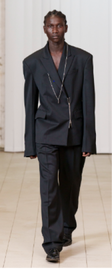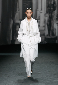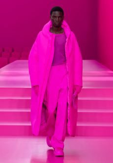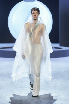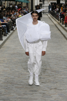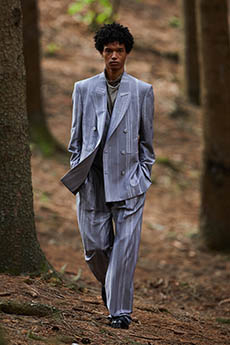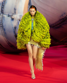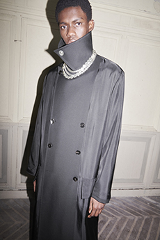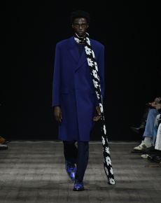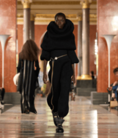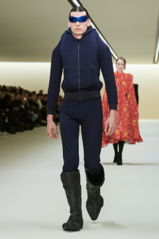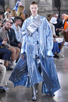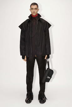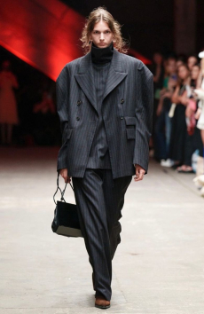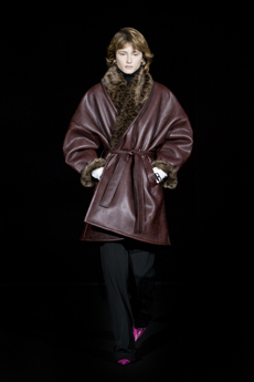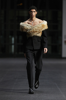Doubled silk shirts, deconstructed faux fur, reinvented corduroy suits, slouchy oversized track suits straight from a rapper's videoclip, followed by the impressive sweatsuits with wired piping in a blobbing volume, reminiscent of that mantle draping we have seen on 1808 Jean-Auguste-Dominique Ingres’s portrait of Napoleon.