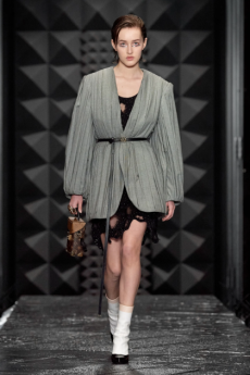 That sexiness, that daring and fierce attitude the Italo-Belgian designer infused in his own shows season after season before becoming the new creative director of the historical Maison. And then there is the show vibe. Anthony Vaccarello presented his second collection for Saint Laurent in a surreal, and provoking atmosphere inside the under-construction site of the new brand’s head quarters in rue Bellechasse at the Left Bank of the Seine. The rain pouring down, the scaffolding as backdrop, the loud pulsing music as in any squat party, was the perfect set as to declare a new beginning, the shaping of the new identity of Saint Laurent in fieri.