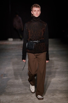 A small trumpet as an earring, a shopper completely covered in off-white cable knit wool, a thin leather belt with an ominous brass nose on its centre. The collection of objets trouvés that populated Loewe Menswear Fall/Winter 2017 is not a new element for the quirky mind of creative director Jonathan Anderson.